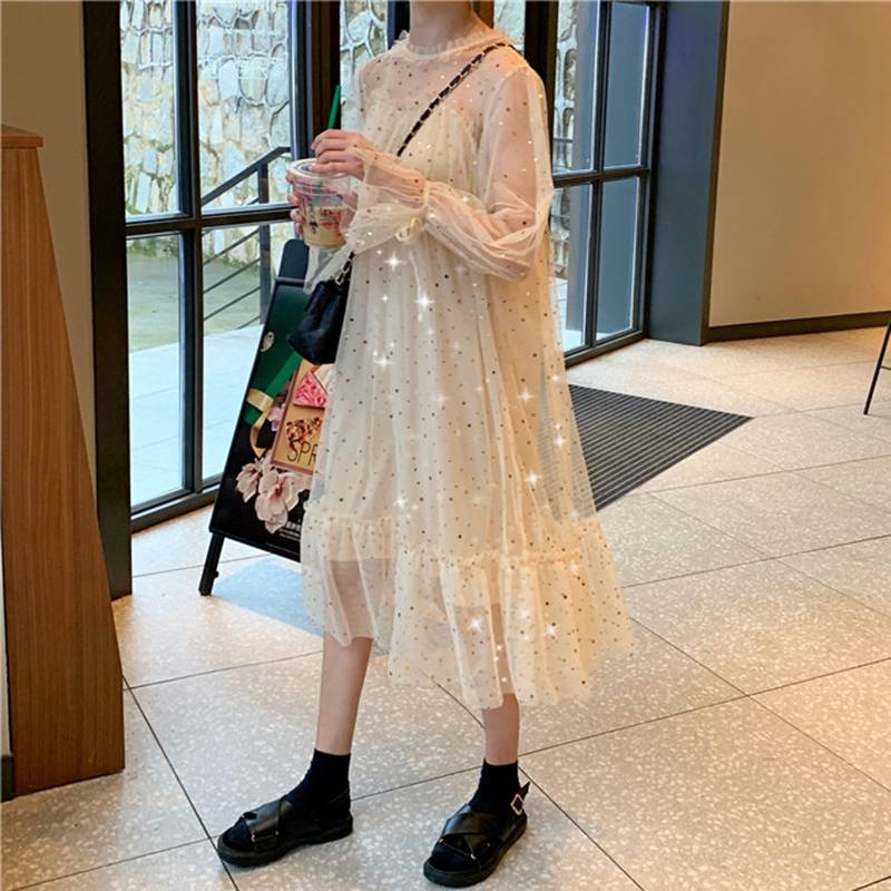 闪闪亮片很仙连衣裙女装夏季新款韩版宽松喇叭袖中长款网纱裙子潮