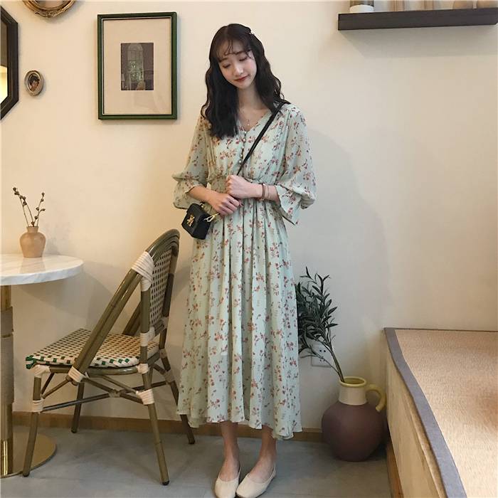 法国小众很仙的碎花连衣裙v领荷叶袖韩版收腰春夏几新款中长款裙