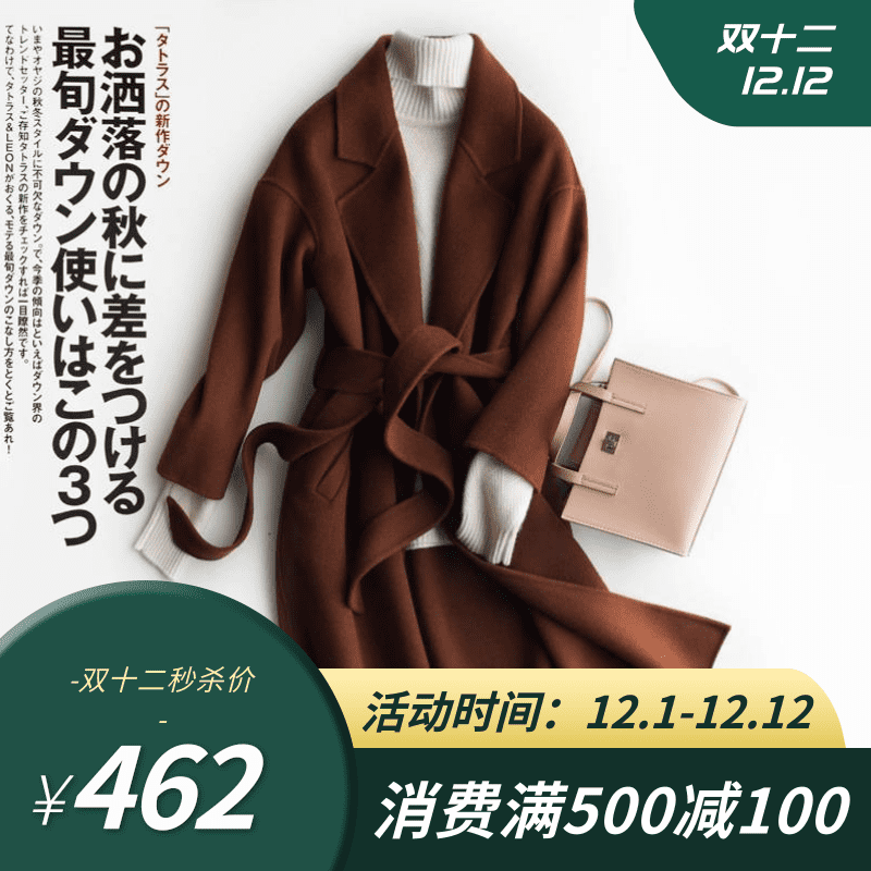 双面羊毛大衣女中长款2020新款赫本风黑色腰带秋冬毛呢外套西装领