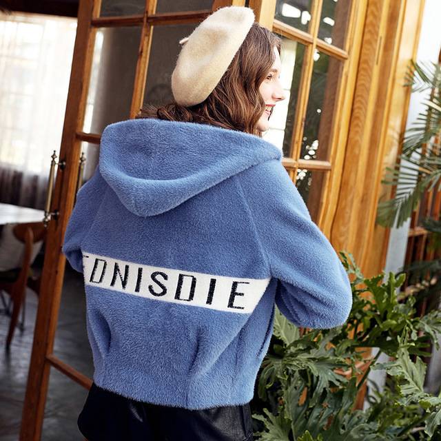 2018冬装新款韩版字母开衫宽松上衣仿水貂绒时尚连帽外套女Y306