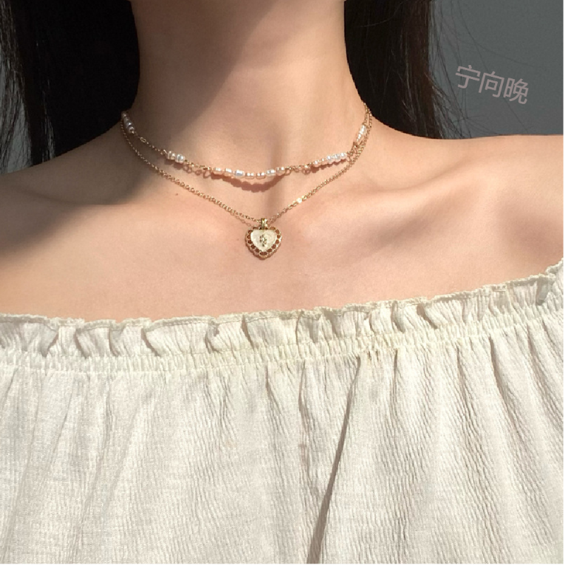 简约法式设计双层项链小众珍珠撞色颈链个甜美爱心形锁骨链女2380