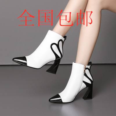 2018秋冬季新款里外真皮女鞋尖头细跟高跟鞋靴女金属电镀跟短靴女