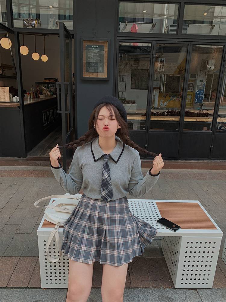 达人汤微胖大码学院风JK制服穿搭撞色针织上衣长袖衬衫舒适吸汗潮