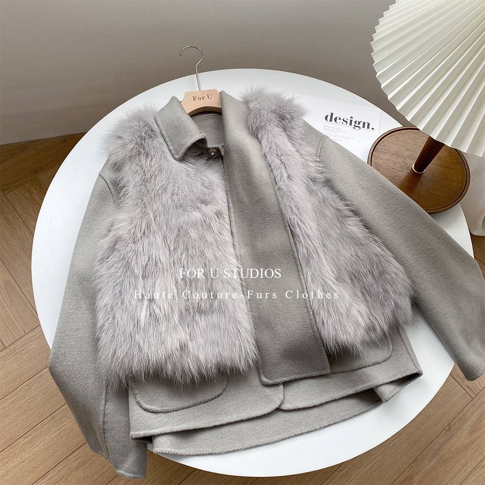 2020冬新款双面呢羊绒狐狸毛皮草外套派克服女年轻款马甲短蝴蝶结