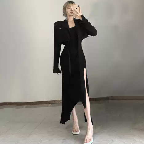 轻熟风气质开叉不规则鱼尾长裙小众短款西装外套女辣妹吊带连衣裙