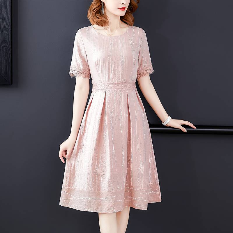 2022年夏季女装减龄显瘦温柔简约粉色镂空圆领短袖修身A字连衣裙