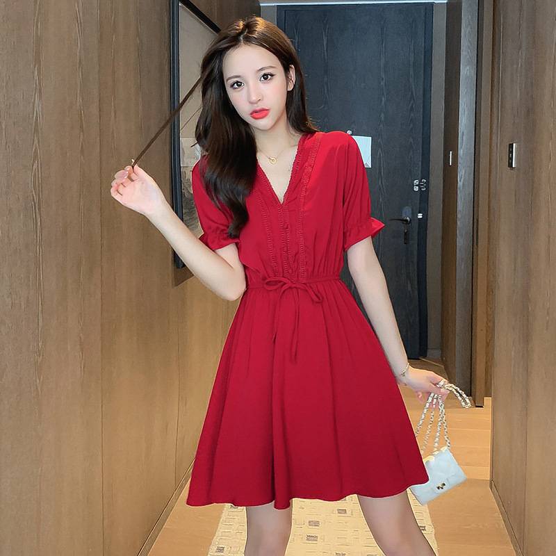 2021夏季新款v领收腰雪纺连衣裙女装小个子显瘦港味a字裙