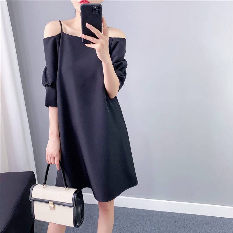 2022夏季新款一字肩吊带连衣裙女直筒宽松超仙气质中长款白色裙子