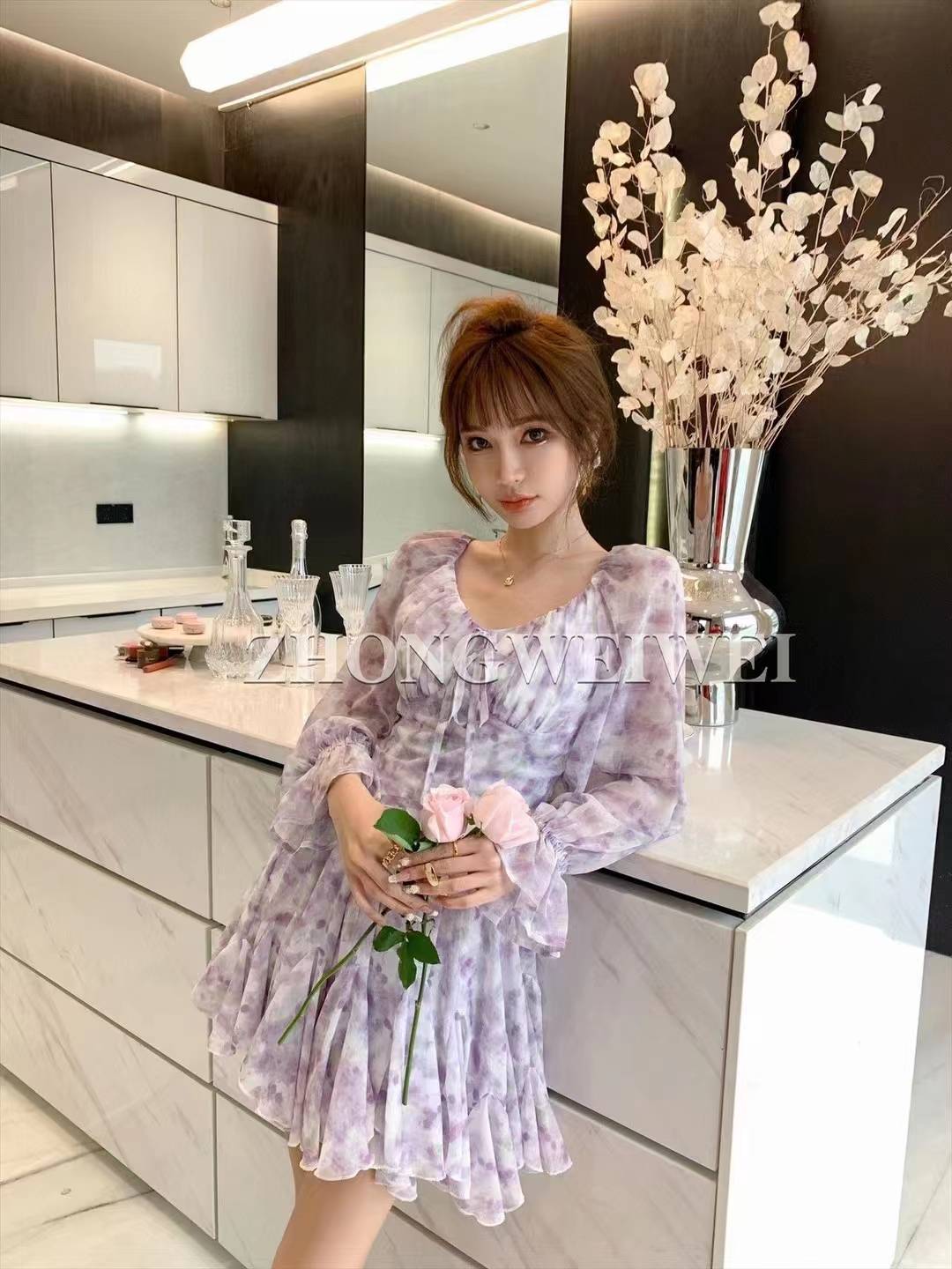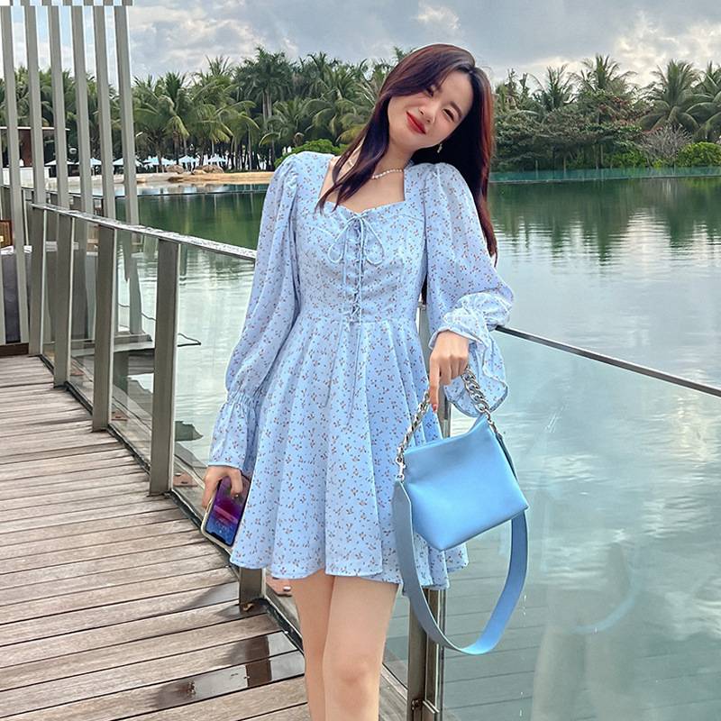 DIGM韩版连衣裙女2022早春新款方领甜美碎花抽绳显瘦长袖短裙1516