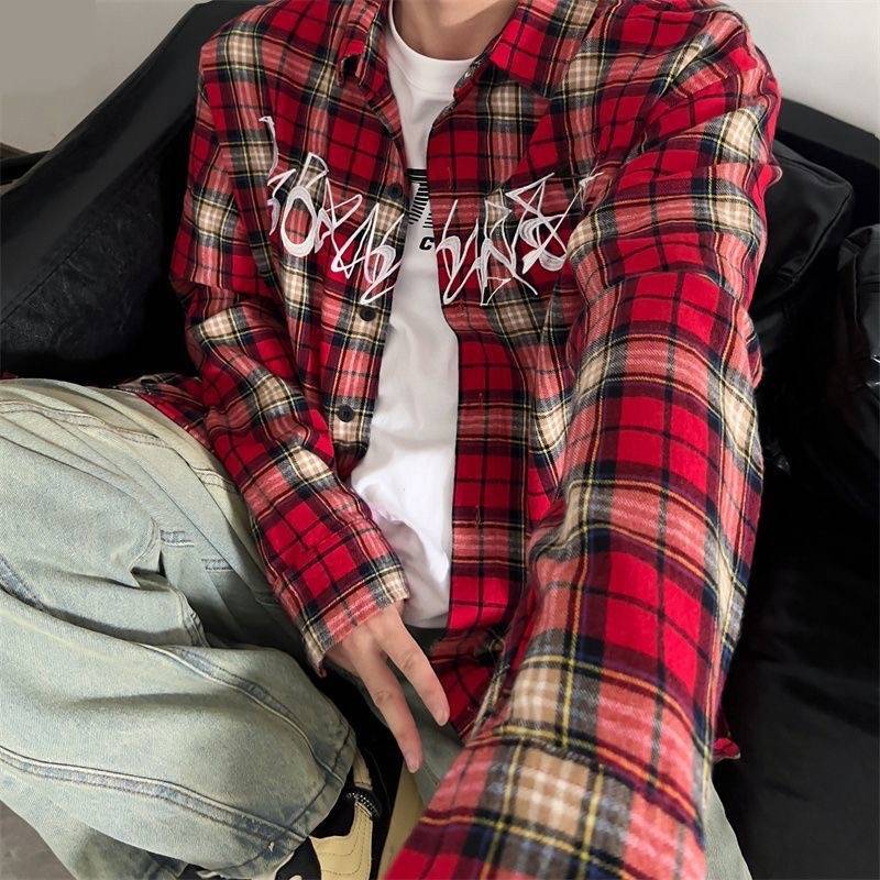 美式复古红色刺绣格子嘻哈风情侣衬衫长袖上衣hiphop高街衬衣外套