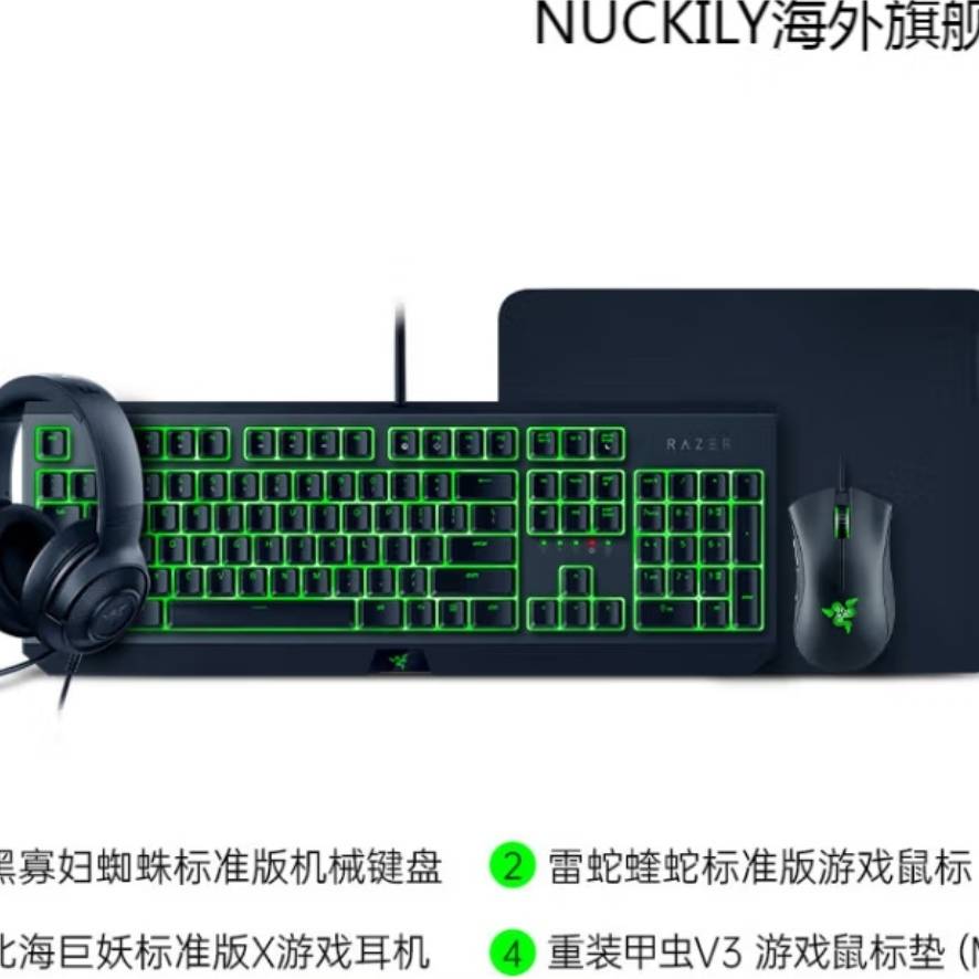 雷蛇Razer黑寡妇机械键盘蝰蛇游戏鼠标绿色背光电脑电竞套装LOL 标准版键鼠垫耳机四件套(段落
