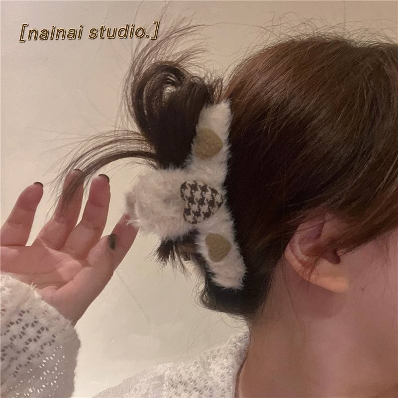 三颗桃心毛绒抓夹千格鸟爱心仿兔毛鲨鱼夹甜美秋冬发夹女