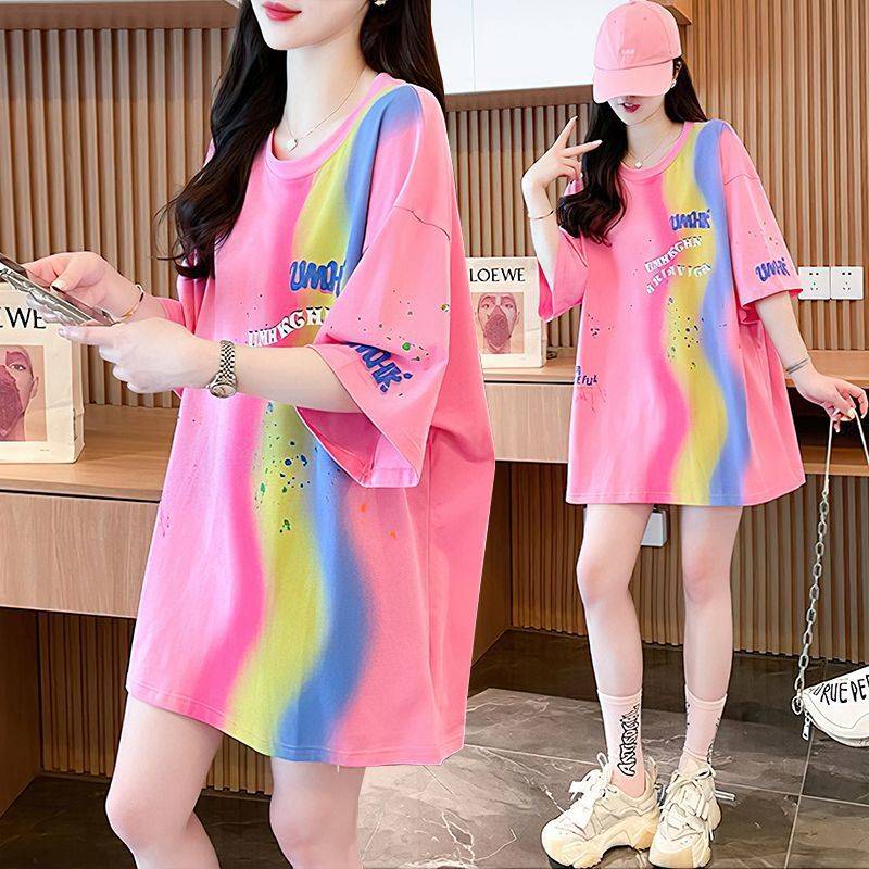 韩版大码女装纯棉短袖T恤女印花涂鸦学生中长款洋气减龄遮肉上衣