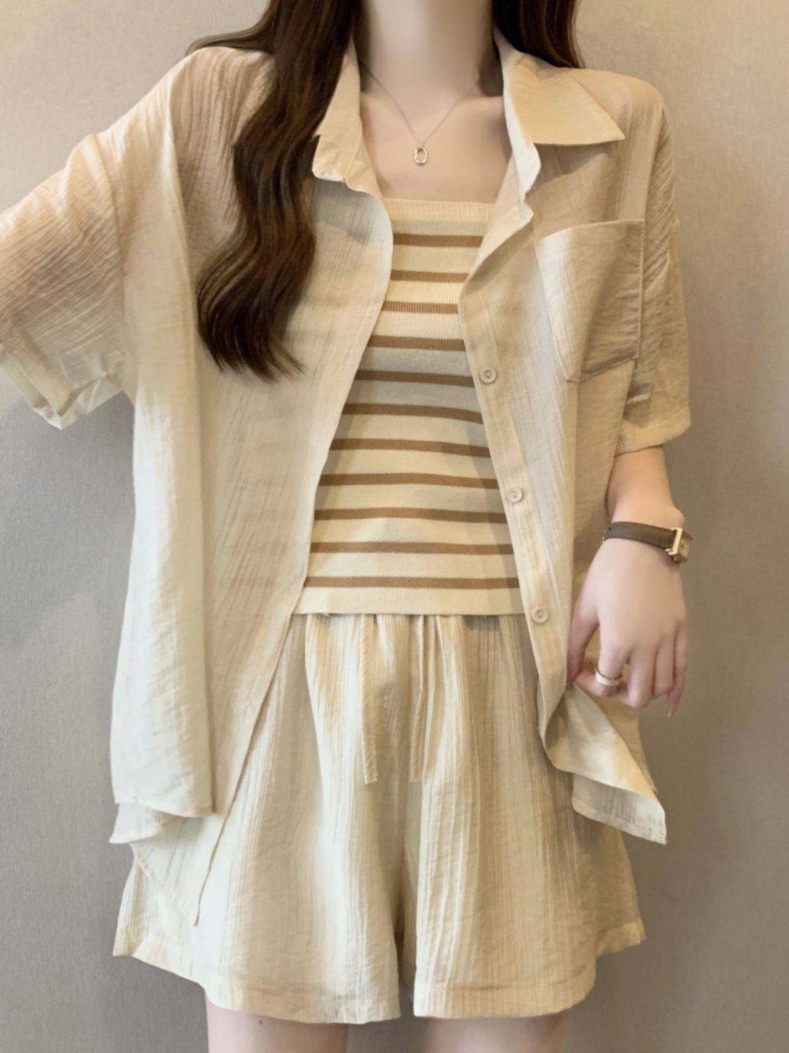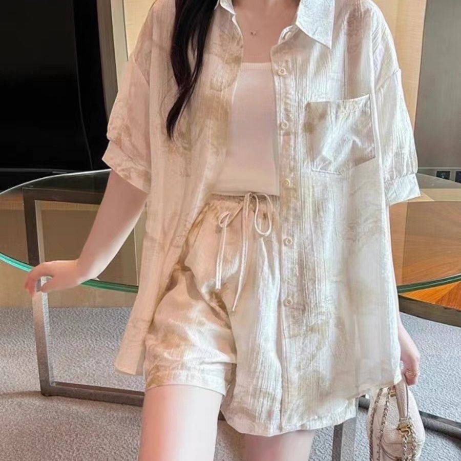新品现货夏季套装女2025新款宽松防晒开衫薄款衬衫外穿搭配短裤三件套