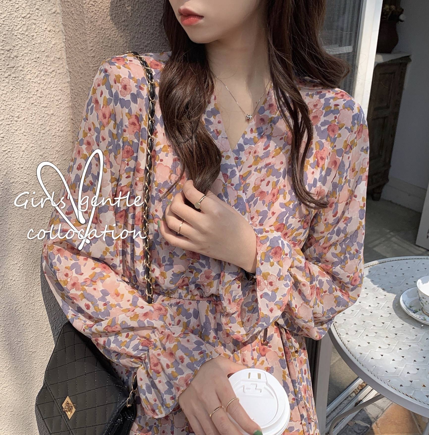 2020春装韩版新款时尚复古小花裙女气质腰过膝连衣裙子潮流