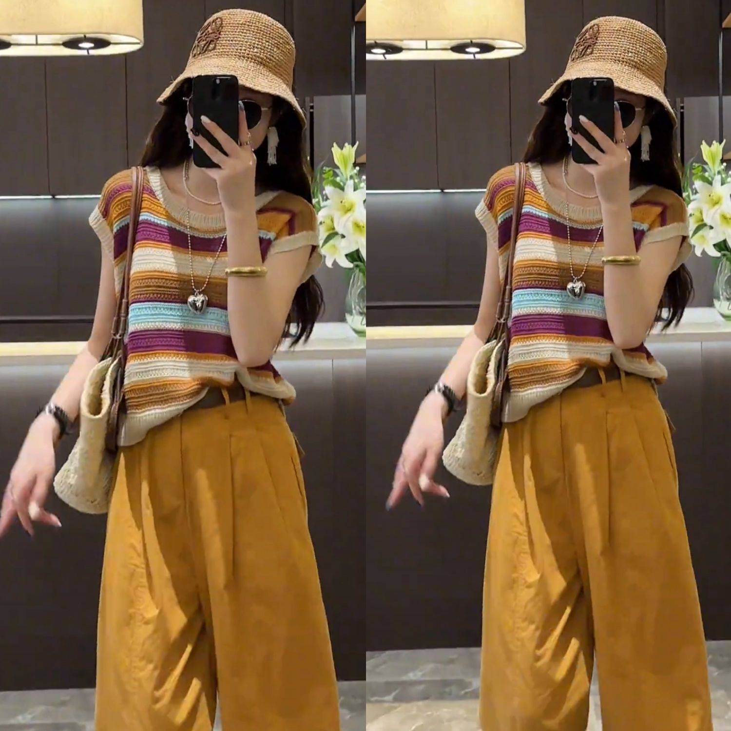 2025夏款洋气时尚镂空撞色无袖条纹宽松上衣 直筒阔腿纯色休闲裤