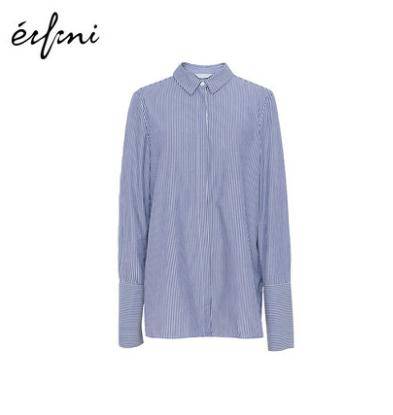伊芙丽2018秋装新款韩版蓝色纯棉修身竖条纹衬衣韩范喇叭袖衬衫女