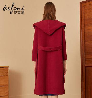 伊芙丽冬装新款韩版长款过膝连帽毛呢外套纯羊毛双面呢大衣女