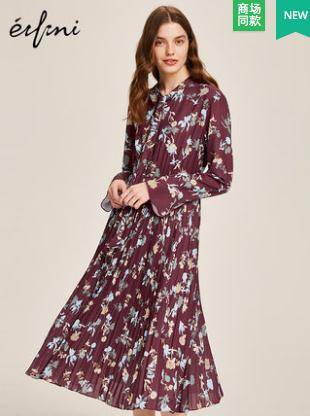何穗同款伊芙丽2018春秋新款韩版长袖高腰中长款百褶连衣裙女