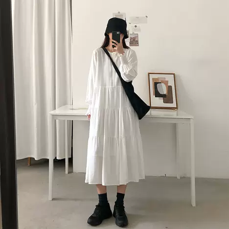 2022秋季新款白色长袖圆领连衣裙女韩版宽松显瘦