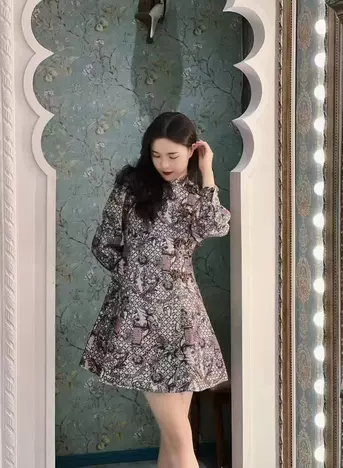 2022秋冬新款立领宫廷风印花收腰蝴蝶结连衣裙