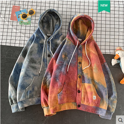 韩版潮流帅气扎染卫衣男港风嘻哈炸街连帽纽扣开衫秋冬宽松bf外套