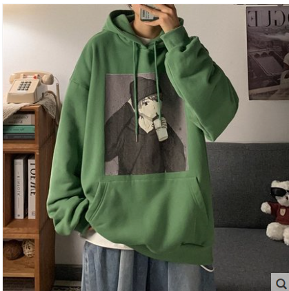 加绒卫衣男秋冬款宽松港风ins男生帅气印花连帽外套加厚百搭衣服