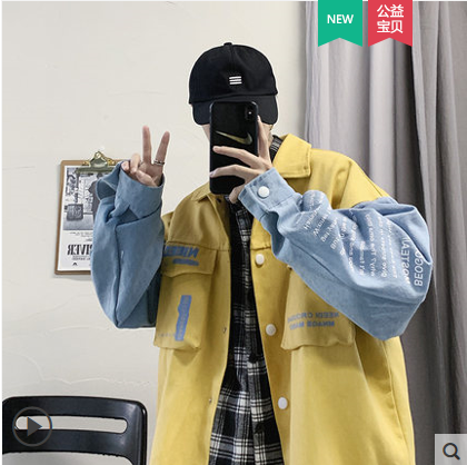 港风ins撞色工装夹克男大码宽松学生bf百搭潮牌上衣秋季痞帅外套
