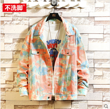 胖子日系扎染潮流搭牛仔衣外套男大码宽松潮牌痞帅秋季褂子夹克