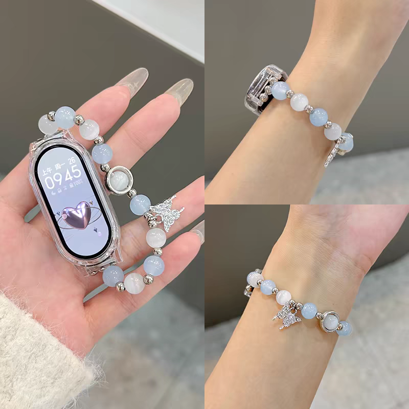适用小米手环8/9表带小米运动智能手环7/6/5/4/3手腕带四五六七八代手环夏天创意金属猫眼石珍珠手链女生nfc