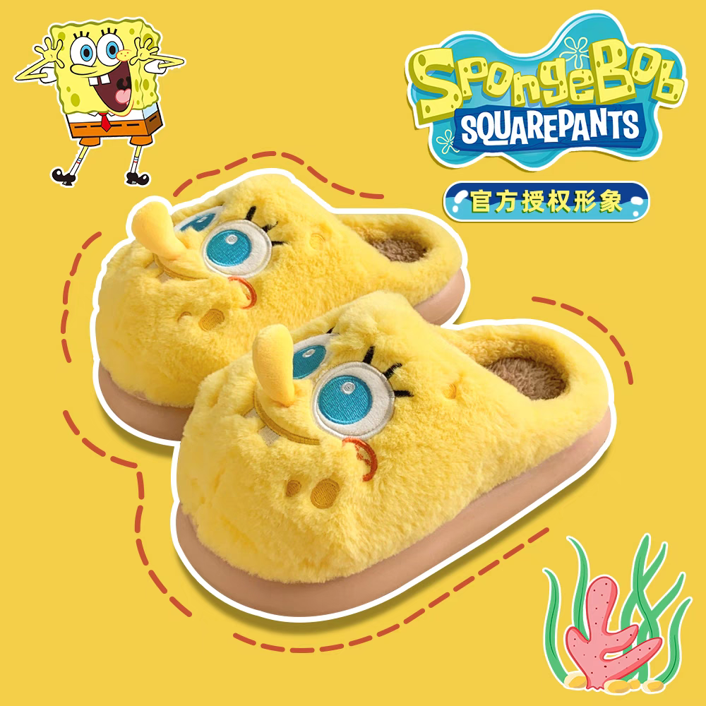 细细条 情侣正版海绵宝宝棉拖鞋保暖居家冬季软底可爱毛毛鞋男女