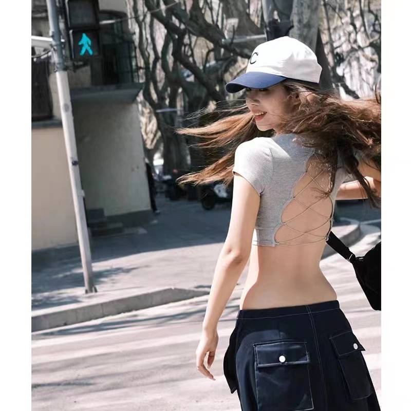 美式辣妹露背绑带小众短袖2023夏季性感露脐短款修身上衣