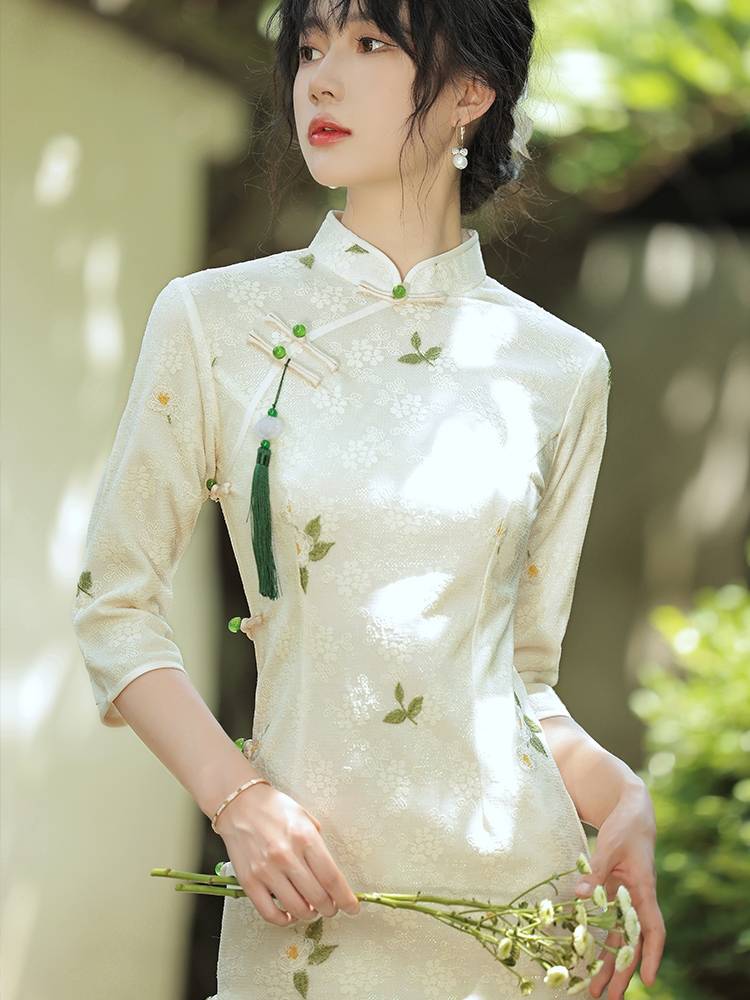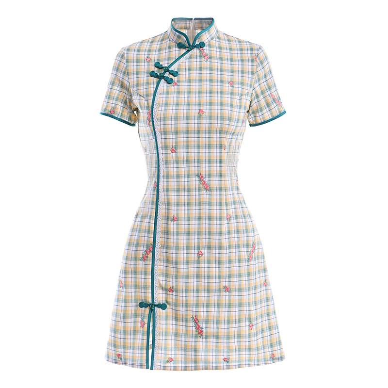 改良版年轻款少女中国风小清新绣花旗袍连衣裙格子2021年新款春夏