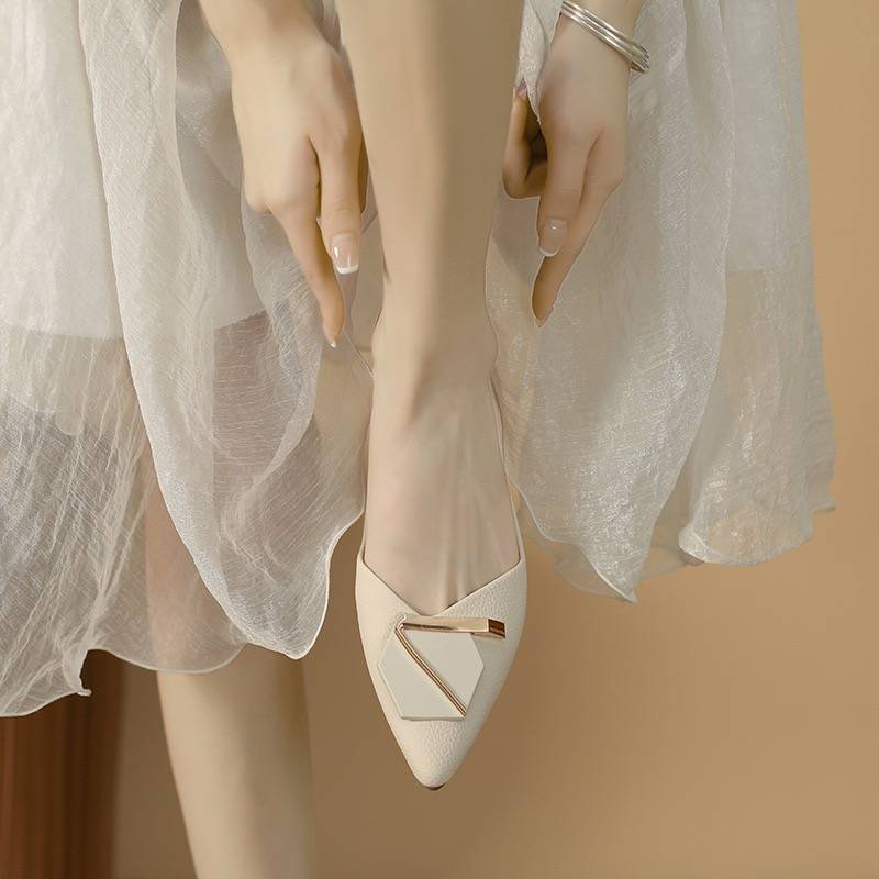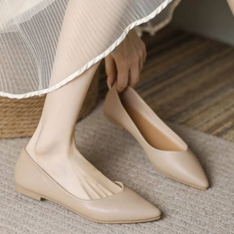 裸色平底鞋女2024新款夏季奶奶鞋尖头工作单鞋软皮仙女小香风大码