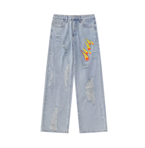 现货复古破洞牛仔裤女新款不规则设计感高腰显瘦阔腿拖地长裤