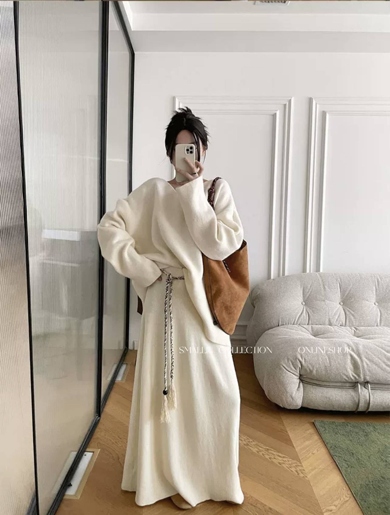 SMALLIU羊剪绒V领极简宽松毛衣女百搭A字长半裙套装女休闲两件套