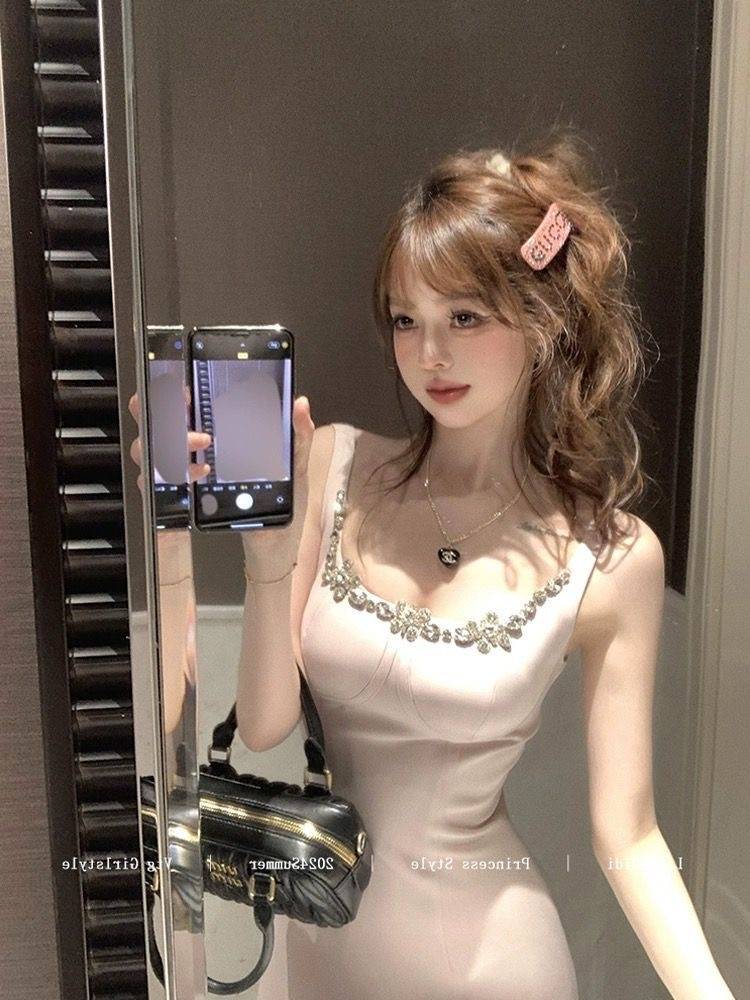 名媛千金水钻吊带连衣裙女夏季法式收腰气质a字裙子生日礼服短裙