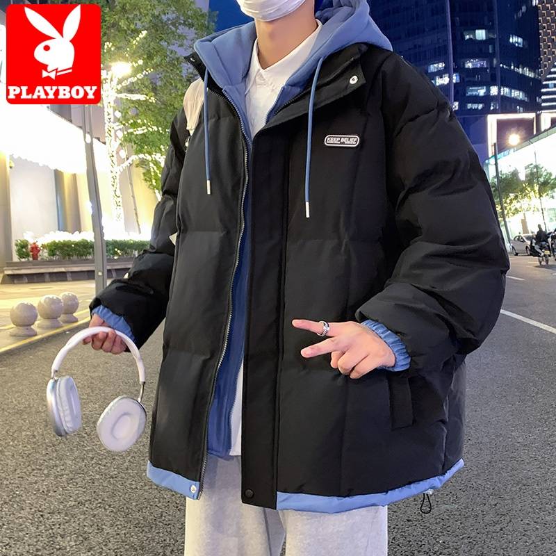 花花公子假两件棉衣男2022冬季新款潮牌加厚连帽棉袄羽绒棉服外套