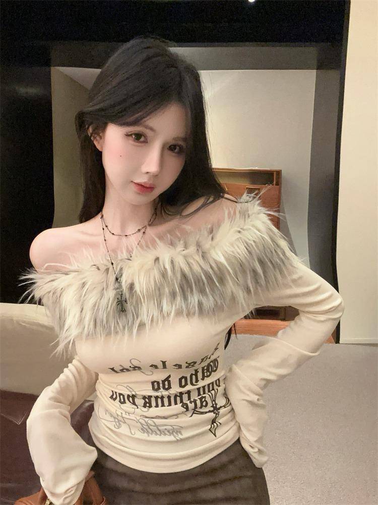 复古新款性感辣妹显瘦毛毛拼接字母印花T恤女一字肩百搭长袖上衣