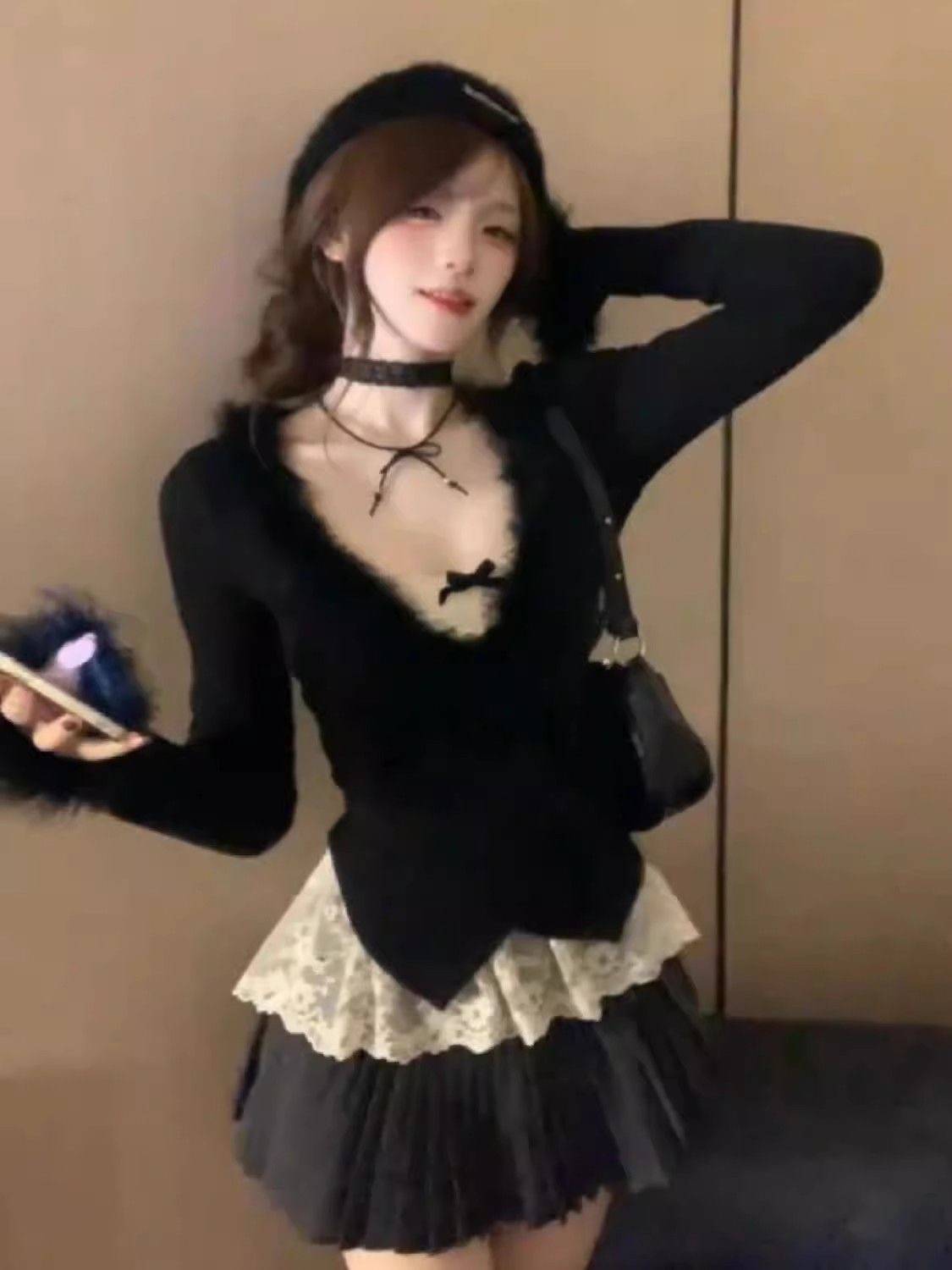 纯欲甜美风设计感两件套装女秋冬毛毛针织开衫搭配蕾丝上衣一整套