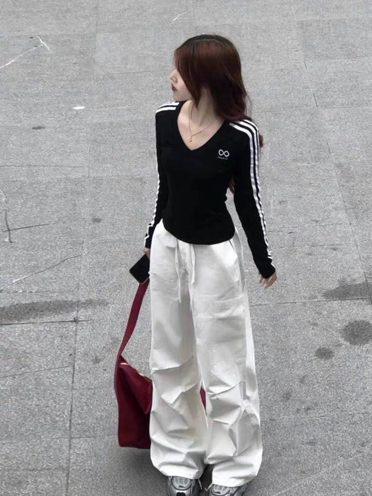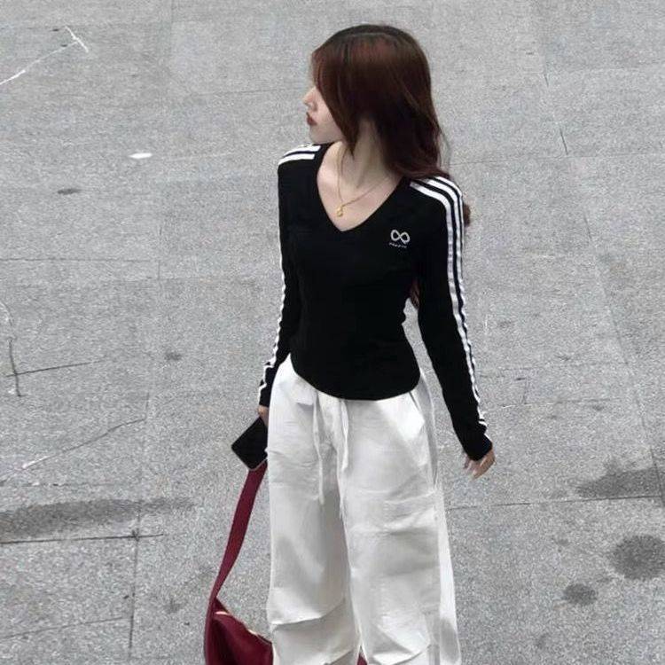 美式辣妹条纹V领短款外穿收腰紧身长袖t恤女春秋季内搭打底衫上衣