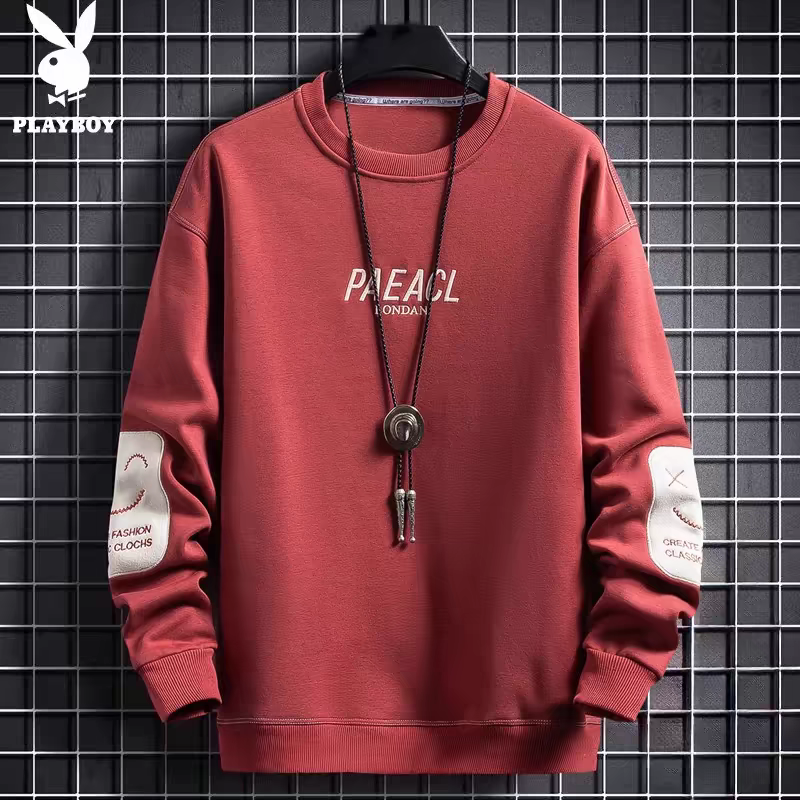花花公子红色卫衣男士2025春季新款休闲圆领上衣服宽松长袖t恤男T
