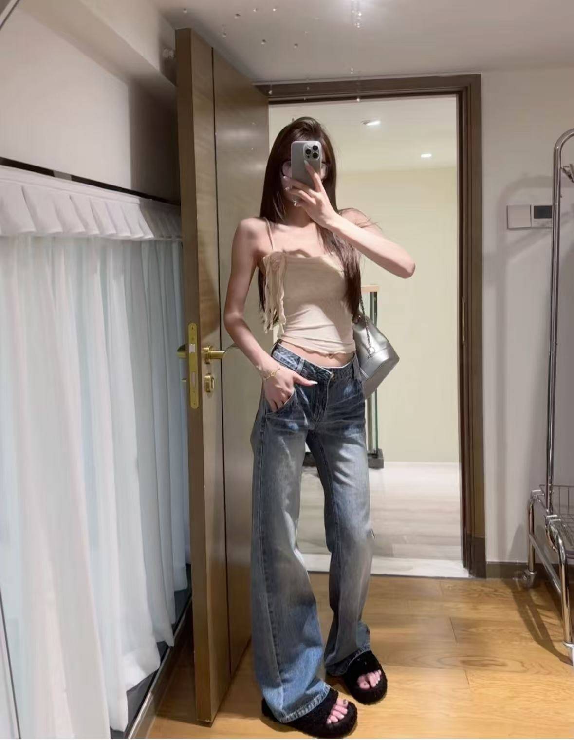粗纹拼条直筒宽松VIBE风微喇叭裤男痞帅长裤子