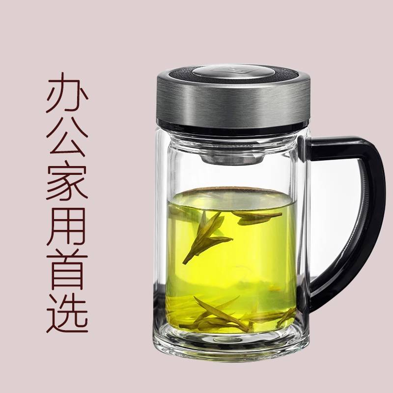 双层玻璃杯水晶杯带手柄办公杯不锈钢过滤网加厚透明水杯