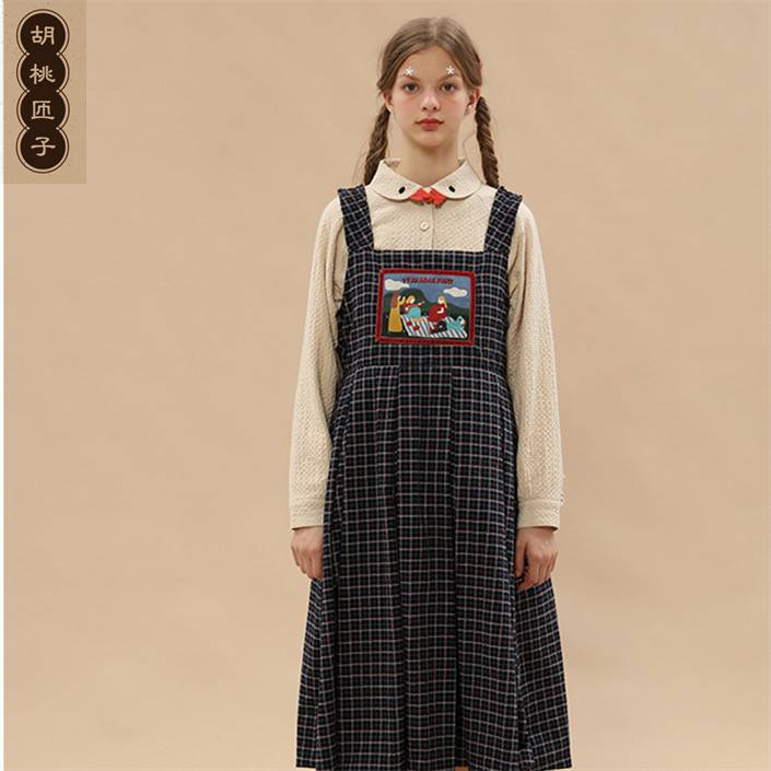 胡桃匝子公园系列女款正反两穿深蓝色格子背带裙