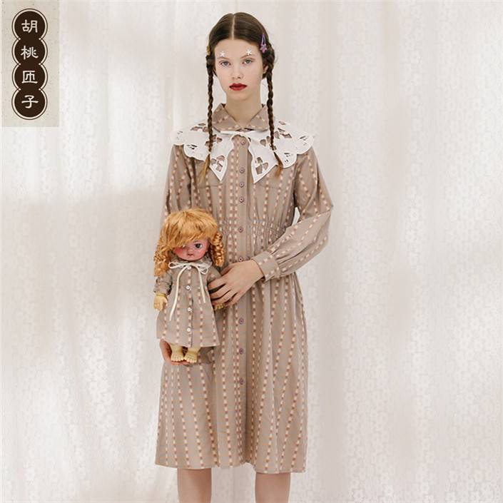 胡桃匝子野餐系列女款藏青色趣味小圆领连衣裙