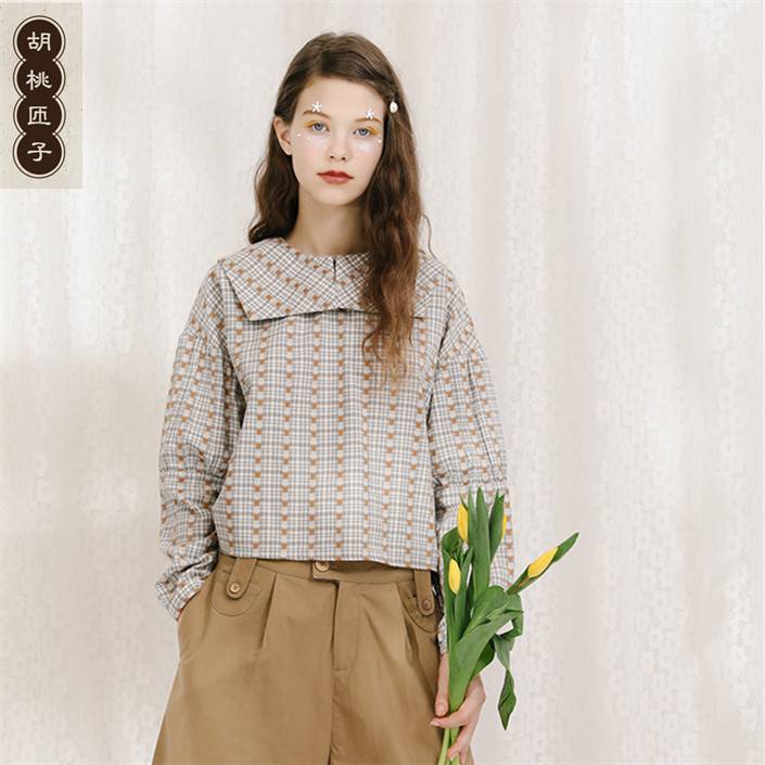 胡桃匝子野餐系列女款黄灰小碎花格纹系带短衬衫