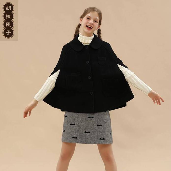 胡桃匝子公园系列女款黑色毛呢斗篷短外套