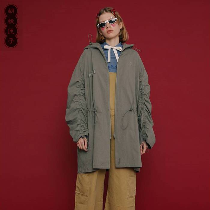 胡桃匝子GOOD LUCK系列男女通款连帽灰绿色长款风衣