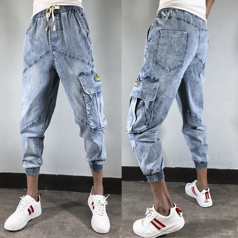 夏季男潮流韩版哈伦大档蓝色工装牛仔裤束脚八分裤精神小伙老爹裤